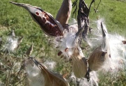 Around the first frost, the milkweed pods will begin to split and release the seeds that float in the air on strands of floss. We recommend that the pods be collected before seeds are released, so unwanted milkweed plant propagation will not occur. Most farmers to not want the milkweed plant growing in their fields. Please be considerate of your neighbors! The seeds can be separated from the pods by shaking the seeds and floss in a bag. The seeds then can be planted or donated to organizations such as Monarch Watch. This organization accepts donated seeds and uses them in their milkweed restoration project. The milkweed floss has excellent insulation properties and can be used to stuff pillows. The empty pods are popular with craft enthusiasts for making wreaths and other items.