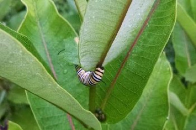 Once your plot is established, flowers will blossom in early summer and will attract the Monarch Butterfly and other pollinator insects such as the honey bee. Soon you will discover tiny yellow and black caterpillars that will quickly grow by eating the Milkweed leaves. In a couple of weeks, the Monarch chrysalis will form. About ten days later, the Monarch Butterfly will emerge, find a mate and eggs will be laid on the Milkweed to start a new generation. Later in the summer, pods will form on the Milkweed plant and the leaves will no longer regenerate.