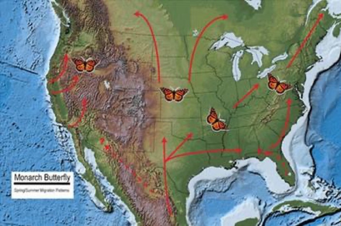 During the migration monarch butterfly depends on pollinator plants, like Milkweed, for food. Three to four generations are required to complete the northern return trip in the spring. The butterflies breed and lay eggs only on milkweed plants on the way back north.